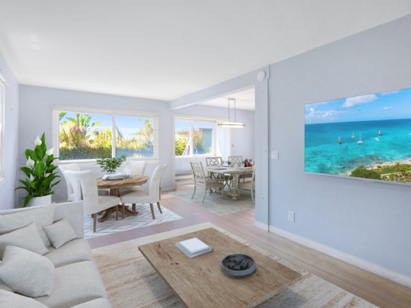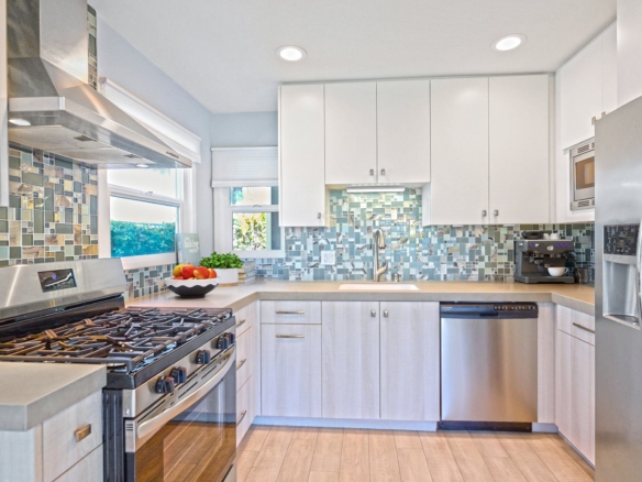 Both units were fully renovated in 2015 with high-end finishes, including double-glazed windows for sound insulation, beamed ceilings, designer tile backsplashes, custom cabinetry, and top-of-the-line stainless steel appliances. Each unit features a spacious bedroom, an upgraded bathroom, a private patio, and shares a two-car garage.